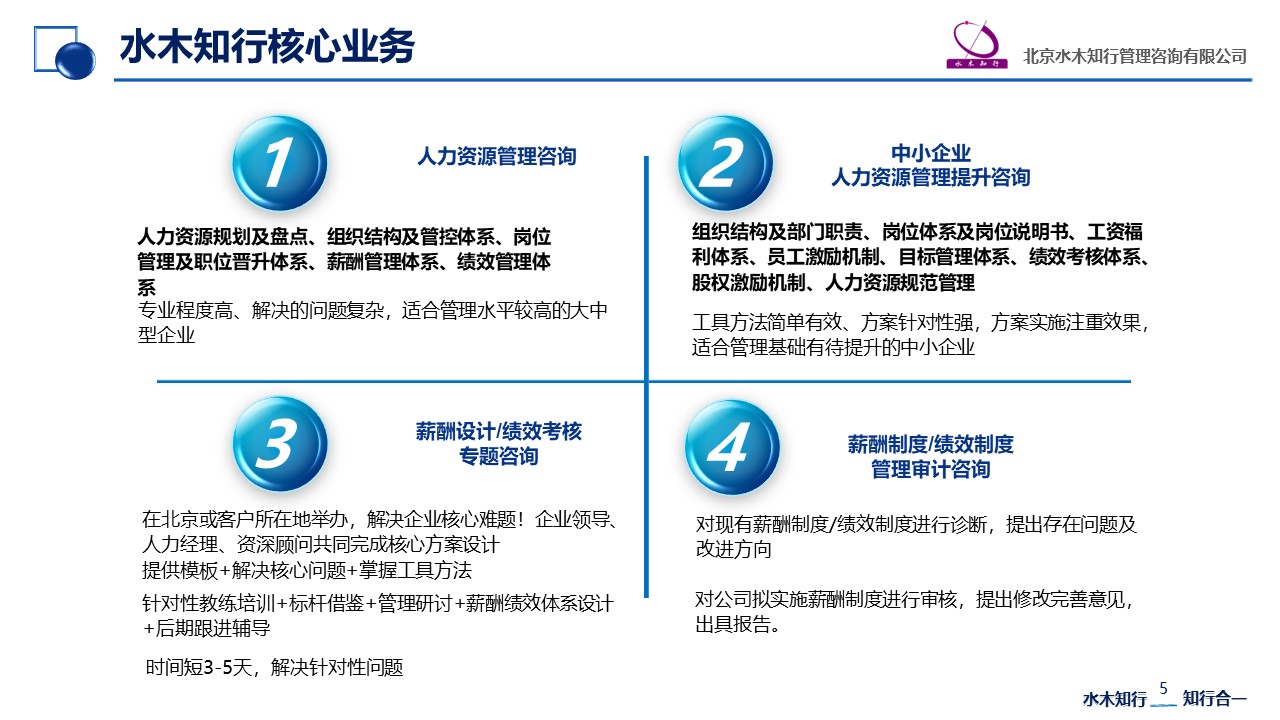 北京水木知行管理咨詢有限公司(www.bjsmzx_com.ve-fit.com)專注提供人力資源管理咨詢、人力資源管理培訓、人力資源招聘咨詢、人力資源獵頭服務業務;咨詢業務范圍包括組織結構與管控體系、崗位管理體系、薪酬管理體系、績效管理體系,咨詢形式包括全過程咨詢、教練式咨詢和特訓班;培訓業務包括企業基礎管理...[詳情]